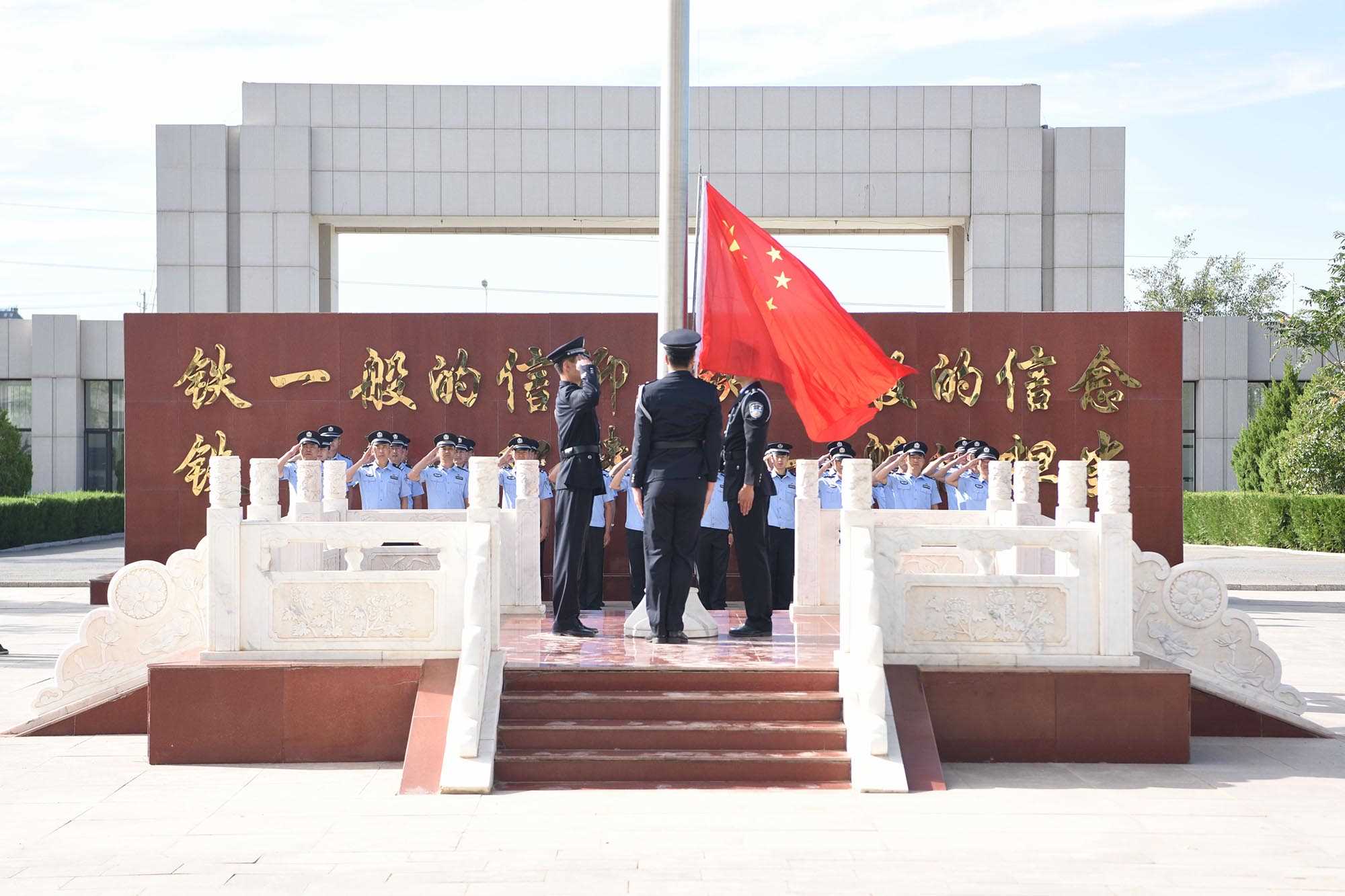 上午9時(shí)整,升國旗儀式正式開始,全體民警在國旗臺前整齊列隊(duì),鮮艷的五星紅旗在激揚(yáng)雄壯的義勇軍進(jìn)行曲中冉冉升起,全體民警精神抖擻、身姿挺拔,向冉冉升起的五星紅旗莊嚴(yán)敬禮,表達(dá)了對祖國母親的崇高敬意以及為黨的事業(yè)奮斗終身的壯志豪情。隨后,全體民警高舉右拳,面對國旗莊嚴(yán)宣誓:“我志愿成為中華人民共和國人民警察,獻(xiàn)身于崇高的人民公安事業(yè)……為維護(hù)社會大局穩(wěn)定、促進(jìn)社會公平正義、保障人民安居樂業(yè)而努力奮斗!”鏗鏘有力的誓言在營區(qū)中久久回蕩,莊嚴(yán)的誓詞再一次銘刻在每名民警心中。活動(dòng)期間,全體民警還觀看了習(xí)近平等黨和國家領(lǐng)導(dǎo)人在中國人民抗日戰(zhàn)爭紀(jì)念館為抗戰(zhàn)烈士敬獻(xiàn)花籃儀式。