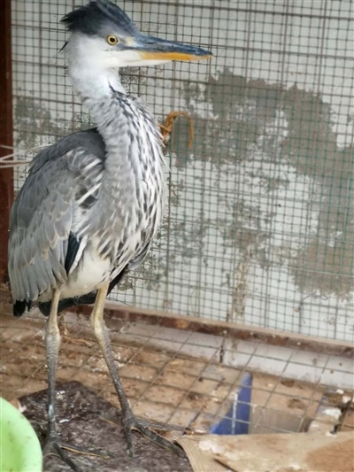 經(jīng)有經(jīng)驗(yàn)的民警辨認(rèn),這是一只蒼鷺幼鳥。這只鳥身高約70公分,長(zhǎng)長(zhǎng)的尖嘴,身著灰色體羽,頭戴深灰色羽冠,兩條大長(zhǎng)腿格外顯眼,白色的前頸縱向排列著黑灰色條紋。民警聯(lián)系獸醫(yī)為其做了體檢,經(jīng)檢查,這只鳥并無傷病,可能是由于剛出窩飛行能力不強(qiáng)、捕食能力不足,造成體力虛弱。民警買來小魚,只見這只鳥狼吞虎咽享用起來,不久便精神十足,開始啄民警??吹剿w力開始恢復(fù),民警懸著的心也就放下了。民警計(jì)劃選擇合適時(shí)間和地方將其放飛。