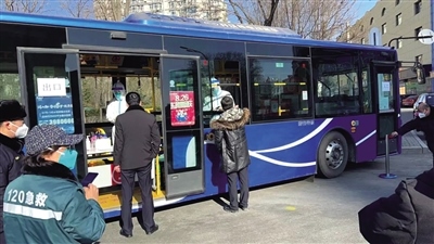 2月28日上午,在呼和浩特市新華大街附近,一輛敞開(kāi)了玻璃窗的公交車(chē)??吭诘缆放裕用駛儼凑找?guī)定間隔排隊(duì),依次來(lái)到公交車(chē)前進(jìn)行核酸采樣,醫(yī)務(wù)人員坐在車(chē)廂座椅有序地為市民進(jìn)行核酸采樣,受檢人員不用上車(chē),站在窗外,采完即走。