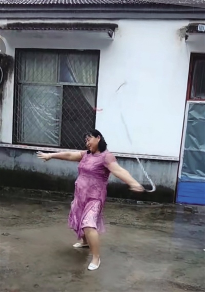 “清水河”大媽與抖音的相遇是在3年前。當(dāng)時(shí),遭遇了親人離世的她悲傷難抑,為了讓她分散注意力,她的女兒幫她下載了抖音。此后,大媽時(shí)常刷刷抖音,也慢慢從中悟出了一個(gè)道理,就是生活中不如意十之八九,人要好好活著,要快樂(lè)地活著。很快,大媽就從悲傷中走了出來(lái),也學(xué)著在抖音上拍攝自己的日常。雖然起初視頻點(diǎn)贊量不多,但能記錄下生活的點(diǎn)滴足以讓她格外開(kāi)心。一直到了去年9月份,大媽無(wú)意之中發(fā)布了一條雨中甩鞭子的視頻。視頻中,大媽身著一襲紅裙,有節(jié)奏地甩起了十幾斤重的鐵制麒麟鞭?!芭距?、啪嗒、啪嗒……”聲聲響亮、威風(fēng)凜凜。就是這條視頻讓她一夜爆紅。此后短短幾天,這條視頻的點(diǎn)贊量就突破了200萬(wàn),一時(shí)間,抖音上還掀起了一陣和大媽合拍的熱潮。