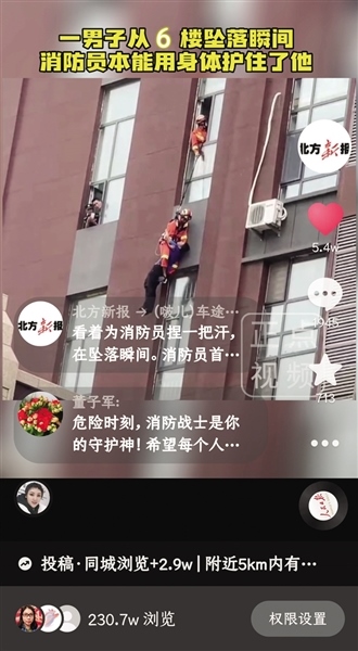 朱先生目睹了整個救援過程,他告訴記者:“那名男子坐在窗戶外沿,搖搖欲墜。雖然是6樓,但這是寫字樓,復(fù)式結(jié)構(gòu),相當(dāng)于普通住宅10樓的高度,非常危險!就在墜落瞬間,消防員本能地用自己身體護(hù)住了他!為他們點(diǎn)贊!”