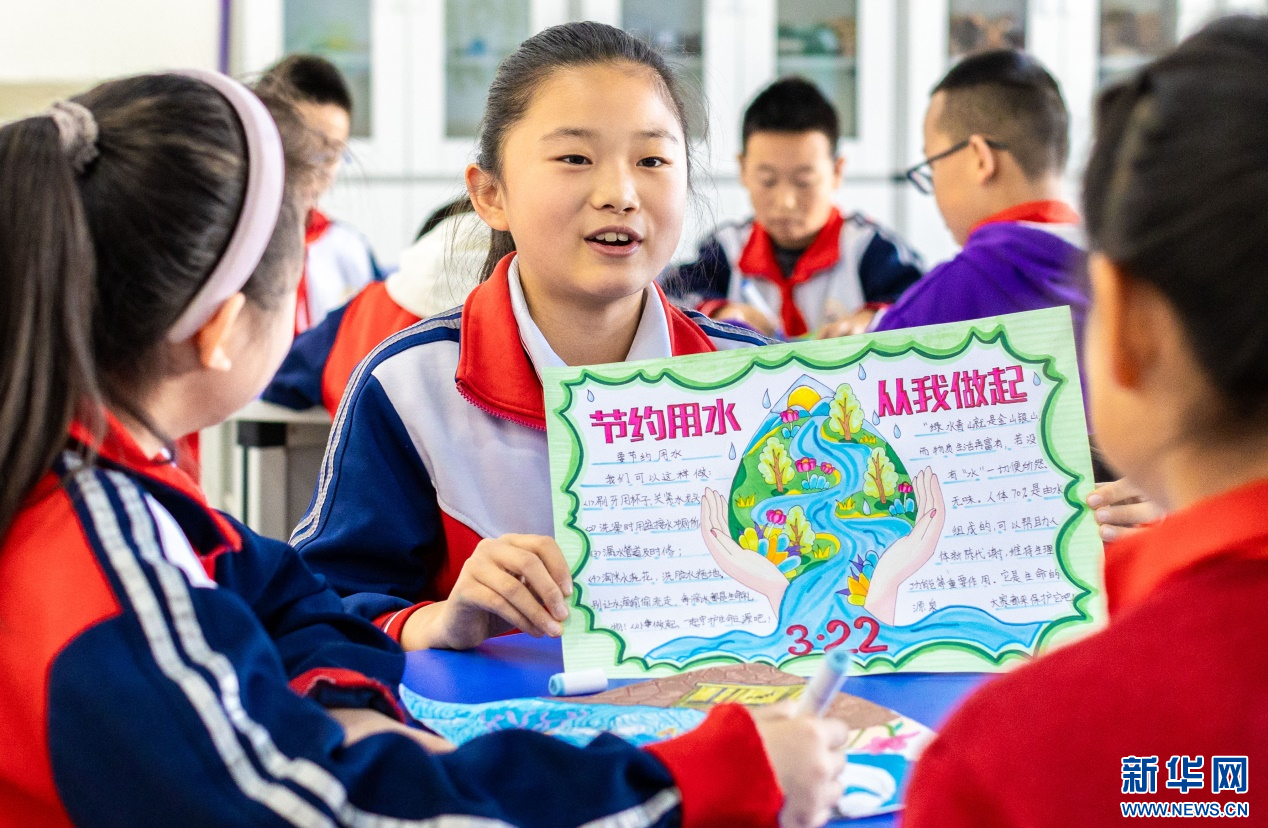 ??3月20日,呼和浩特市玉泉區(qū)石東路小學(xué)學(xué)生在班隊(duì)會上分享節(jié)水小妙招。新華網(wǎng)發(fā)(丁根厚 攝)