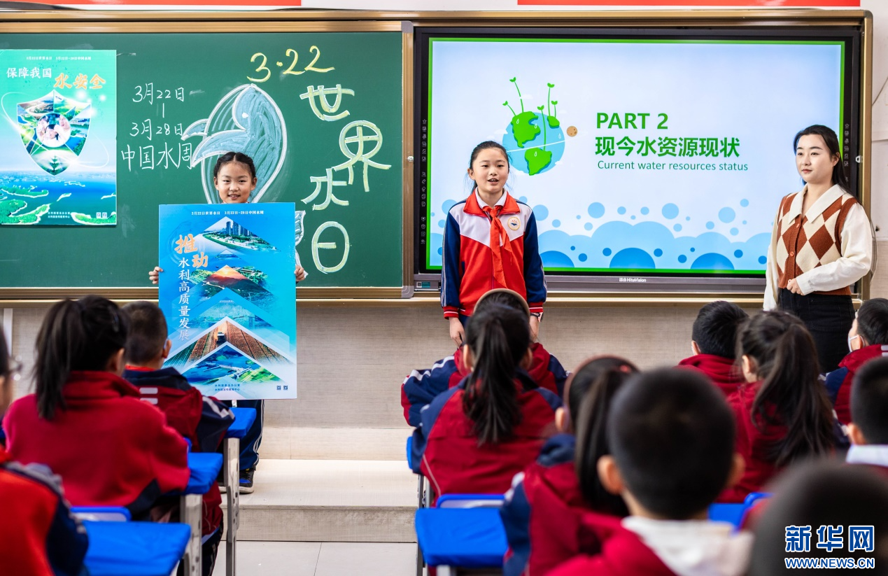 ??3月20日,呼和浩特市玉泉區(qū)石東路小學(xué)老師向?qū)W生們講解水資源現(xiàn)狀等知識。新華網(wǎng)發(fā)(丁根厚 攝)