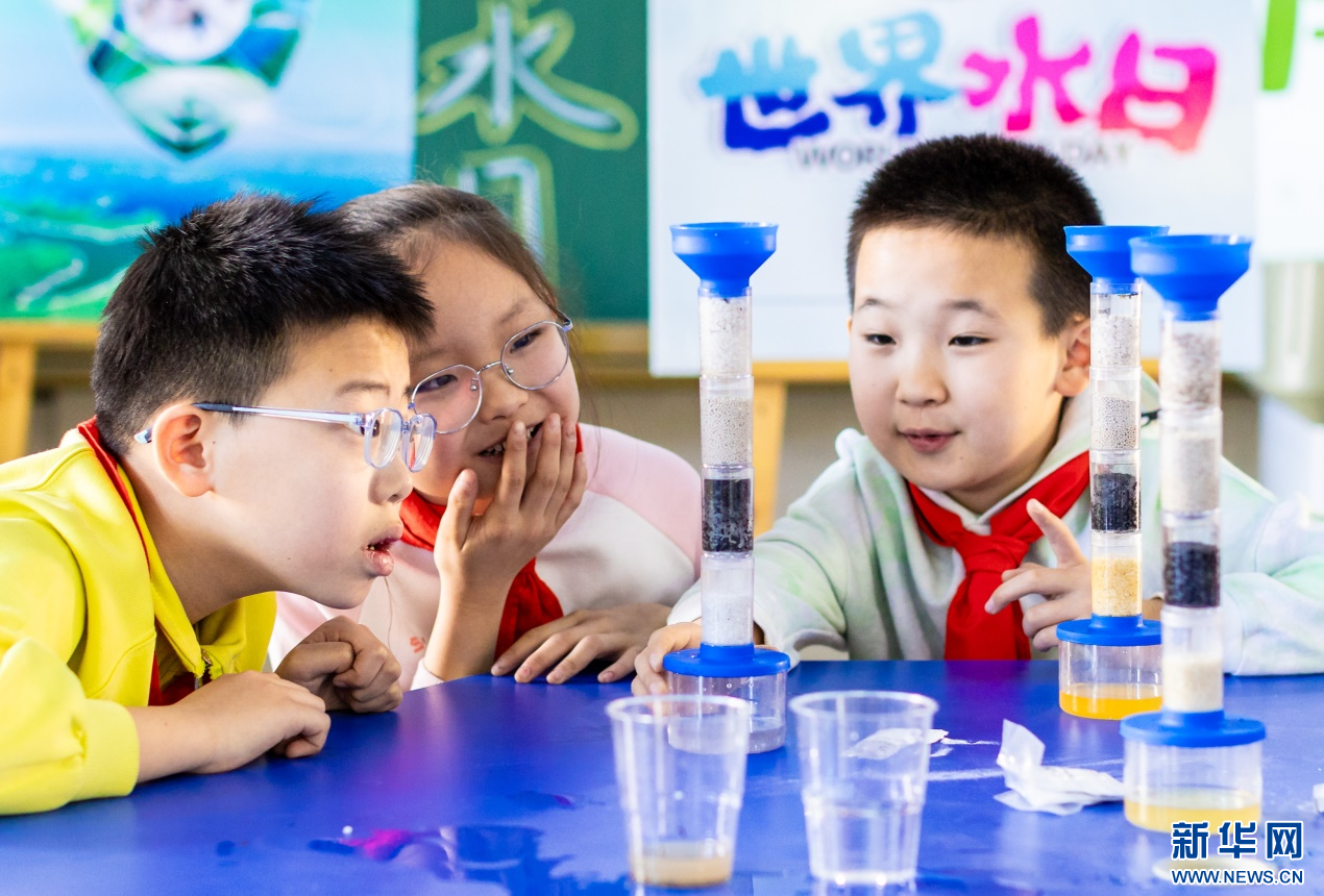 ??3月20日,呼和浩特市玉泉區(qū)石東路小學(xué)學(xué)生在老師指導(dǎo)下,使用簡易凈水器做凈水實(shí)驗(yàn)。新華網(wǎng)發(fā)(丁根厚 攝)