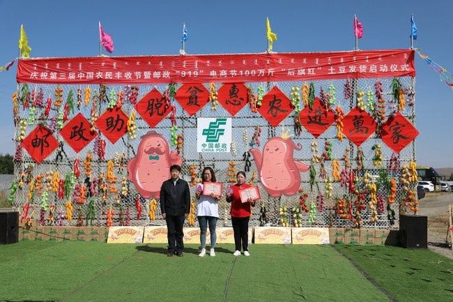據(jù)介紹,“919電商節(jié)”,是中國(guó)郵政集團(tuán)公司利用線上電商平臺(tái),開(kāi)展農(nóng)產(chǎn)品進(jìn)城、助力農(nóng)民脫貧致富的惠民活動(dòng)。今年活動(dòng)期間,擬銷售“后旗紅”土豆100萬(wàn)斤,可以讓一家扶貧龍頭企業(yè)、一家合作社、500多戶農(nóng)牧戶受益。其中北方馬鈴薯批發(fā)市場(chǎng)帶動(dòng)200戶貧困戶參與集體分紅,戶均增收1000元;高價(jià)收購(gòu)15戶貧困戶、20戶農(nóng)戶馬鈴薯20萬(wàn)斤,戶均增收1600元;直接間接帶動(dòng)務(wù)工人員265人,人均增收420元;活動(dòng)期間將為28戶農(nóng)戶提供免費(fèi)耕作服務(wù),免費(fèi)耕作土地總畝數(shù)940畝,幫助28戶農(nóng)戶節(jié)省開(kāi)支42300元,戶均節(jié)省1511元。