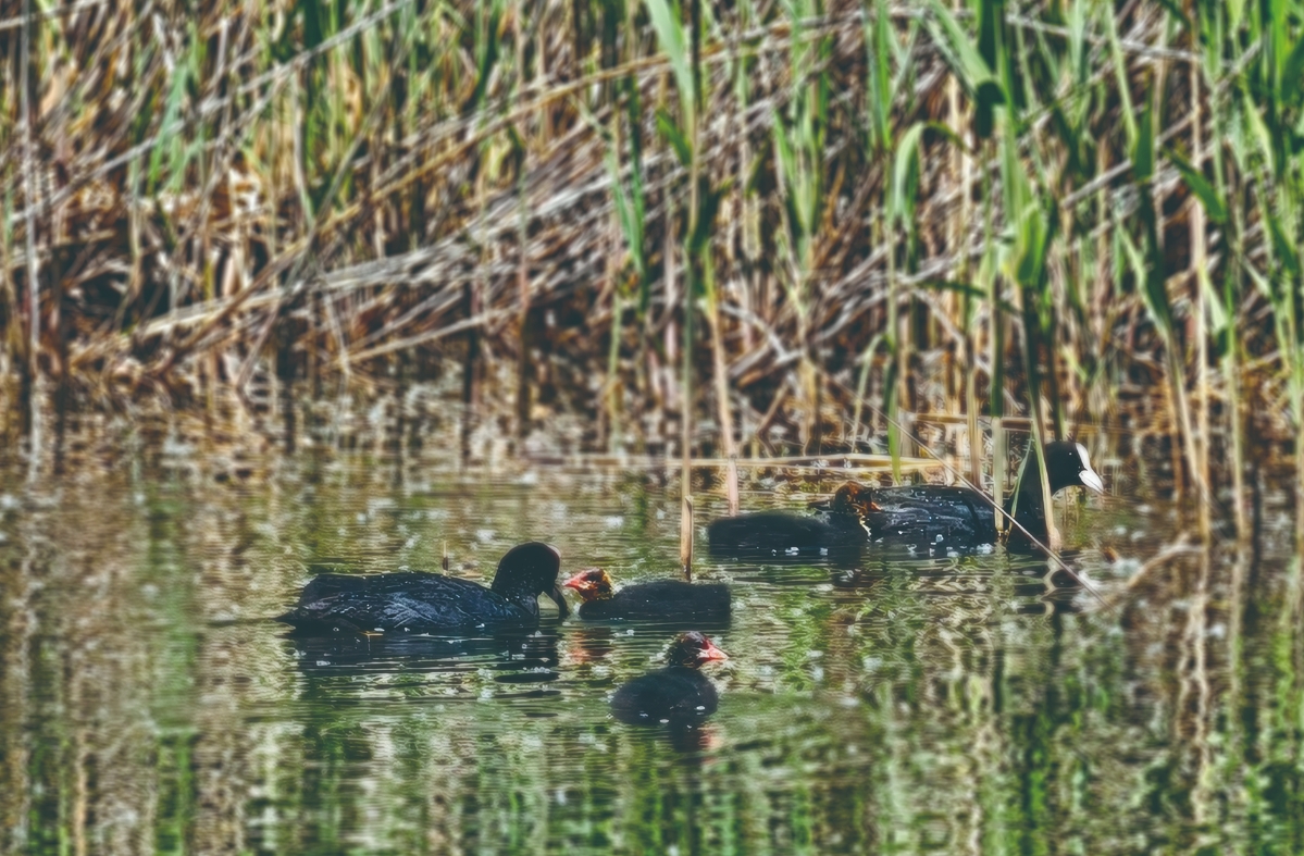 在不遠(yuǎn)處的水域,白骨頂雞一家成為眾人關(guān)注的焦點(diǎn)。幾只剛剛出窩的幼鳥(niǎo),圓滾滾、毛茸茸的,正好奇地在水中游動(dòng),動(dòng)作略顯笨拙,還不時(shí)發(fā)出稚嫩的叫聲。成年白骨頂雞則忙著覓食,它們一頭扎進(jìn)水里,再浮出水面時(shí),嘴里已叼著小魚(yú)小蝦,隨后快速游向幼鳥(niǎo)喂食。幼鳥(niǎo)們爭(zhēng)搶食物的場(chǎng)景,充滿(mǎn)了趣味。