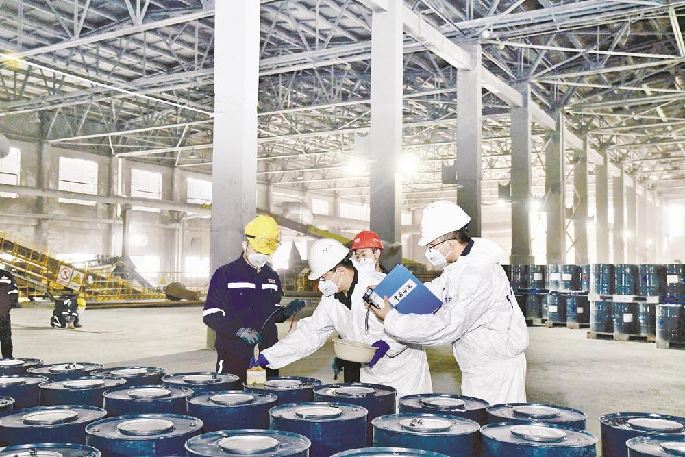 近日,烏海海關(guān)關(guān)員對內(nèi)蒙古宜化化工有限公司出口的化工產(chǎn)品進(jìn)行檢查,不久后,這些產(chǎn)品將通過陸海聯(lián)運銷往東南亞市場。(王超 攝)