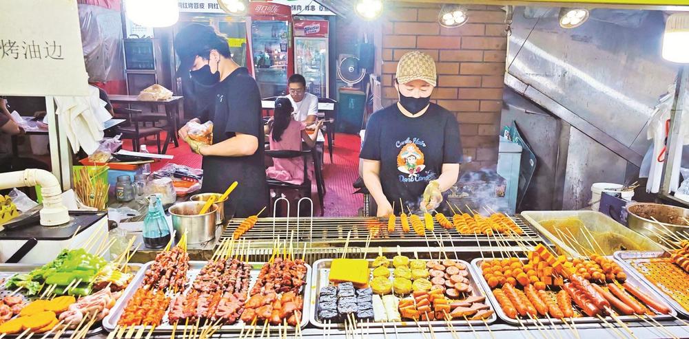 炭火上的羊肉串嗞嗞作響,油脂滴落,迸出金色火花,散發(fā)出誘人的香氣??腿藝谒芰闲∽琅裕掷锬弥?zhèn)啤酒,碰杯傳出清脆的響聲……這里沒有高檔餐廳的拘謹,只有朋友相聚的歡樂和大口吃肉的暢快。大學生徐瑞虹放暑假后,經(jīng)常和朋友來夜市消暑?!拔覀儙讉€沒事就來萬達金街轉(zhuǎn)一轉(zhuǎn),天太熱了,待在家里也悶,而且夜市里的這些小吃我們都比較喜歡,沒事幾個人喝幾瓶啤酒,聊一聊天,感覺還是很愜意的?!睂τ谀贻p人來說,夜市不僅是美食的聚集地,更是釋放壓力、享受生活的好去處。在這里,他們可以暫時拋開煩惱,盡情享受美食帶來的快樂。