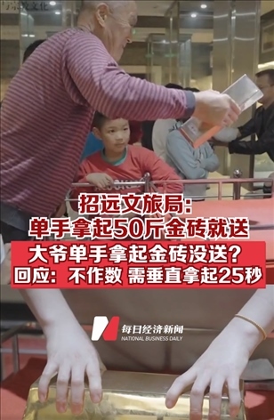 ·山東煙臺招遠文旅局:單手拿起50斤金磚就送!大爺單手舉起50斤金磚沒拿走?回應:不作數,需垂直拿起25秒。
