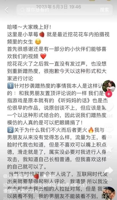 “小草莓老師”也在5月3日發(fā)文回應(yīng)稱,不存在誰(shuí)是原創(chuàng)的問(wèn)題。