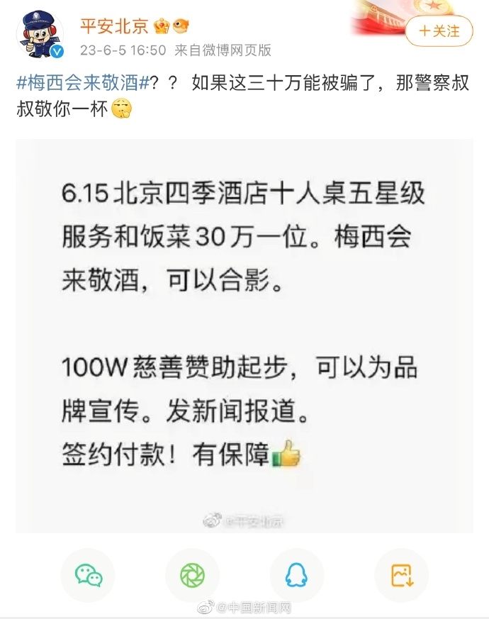 ·30萬可讓梅西敬酒?平安北京提醒:別信。