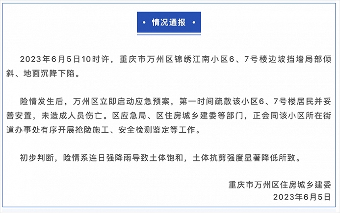 ·重慶萬州區(qū)一小區(qū)地面沉降,官方:系連日強(qiáng)降雨所致,未造成人員傷亡。
