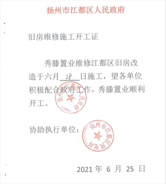 “搞定”西苑社區(qū)后,楊某軍偽造一份《揚(yáng)州市江都區(qū)人民政府舊房維修施工開工證》,并加蓋“揚(yáng)州市江都區(qū)人民政府 178962”“揚(yáng)州市江都區(qū)規(guī)劃局”公章。周女士獲得該證后,立即組織顧先生進(jìn)場施工。“楊某軍讓我先墊付材料款和人工費(fèi),后面等財(cái)政撥款就行。我就安排顧先生7月1日進(jìn)場施工?!?/p>