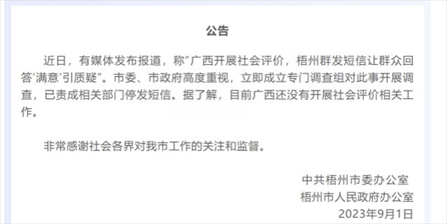 ·網傳廣西開展社會評價,梧州群發(fā)短信讓群眾回答“滿意”,梧州市政府:開展調查,已責成相關部門停發(fā)短信。據了解廣西還未開展社會評價相關工作。