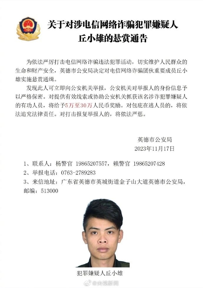近日,廣東英德市公安局對電信網(wǎng)絡(luò)詐騙團伙重要成員張永勝、丘小雄、徐培星、張方文、巫昌發(fā)、鄧寶運、鄧海堅實施懸賞通緝。發(fā)現(xiàn)上述人員立即向公安機關(guān)舉報,對提供有效線索或協(xié)助公安機關(guān)抓獲該名涉詐犯罪嫌疑人的有功人員,將給予5萬至30萬人民幣獎勵。