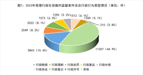 5.行政爭議實(shí)質(zhì)性化解持續(xù)深化做實(shí)。針對司法實(shí)踐中一些行政案件程序已結(jié)但訟爭未解的“程序空轉(zhuǎn)”“案結(jié)事不了”等問題,2023年共促進(jìn)案涉行政爭議實(shí)質(zhì)性化解22310件,同比上升26%。其中,行政生效裁判監(jiān)督案件8524件,占38.2%;行政審判活動(dòng)監(jiān)督案件2269件,占10.2%;行政執(zhí)行活動(dòng)(含非訴執(zhí)行)監(jiān)督案件11517件,占51.6%。