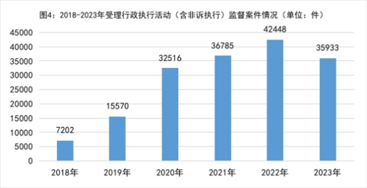 4.行政執(zhí)行活動(dòng)監(jiān)督發(fā)展迅速,行政非訴執(zhí)行監(jiān)督占主導(dǎo)。2018年以來受理行政執(zhí)行活動(dòng)(含非訴執(zhí)行)監(jiān)督案件分別是:2018年7202件、2019年15570件、2020年32516件、2021年36785件、2022年42448件,年均增加55.8%。2023年受理35933件,同比下降15.3%。其中,行政非訴執(zhí)行活動(dòng)監(jiān)督34938件,占97.2%;行政訴訟執(zhí)行活動(dòng)監(jiān)督995件,占2.8%。針對超期執(zhí)行、執(zhí)行裁定或決定違反法定程序、違法裁定終結(jié)本次執(zhí)行、怠于申請強(qiáng)制執(zhí)行等問題,向法院、行政機(jī)關(guān)提出檢察建議31790件,同比下降12.8%。