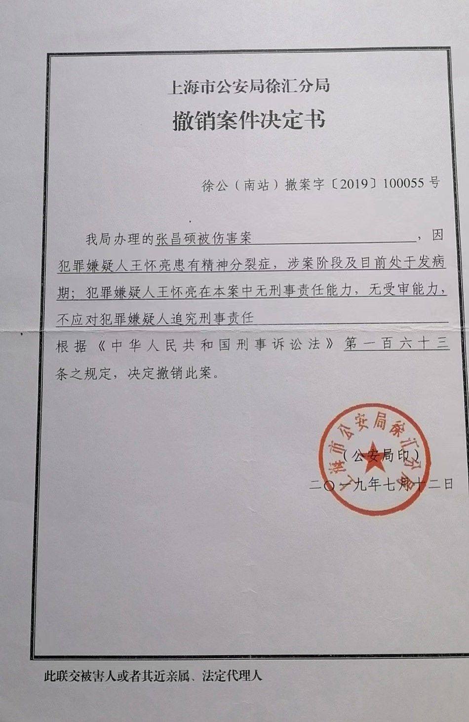 張宏銀回憶,他已經(jīng)不記得這起依法不負刑事責任的精神病人強制醫(yī)療程序案件開庭審理的具體時間,只記得是2019年下半年的一天上午,那天犯罪嫌疑人沒有到場,律師也沒有到場,檢察院的兩位人員出席了開庭。徐匯區(qū)法院當庭做出判決:王懷亮被送往醫(yī)療機構(gòu)進行強制醫(yī)療。2019年7月12日,張宏銀收到公安局的撤銷案件決定書。