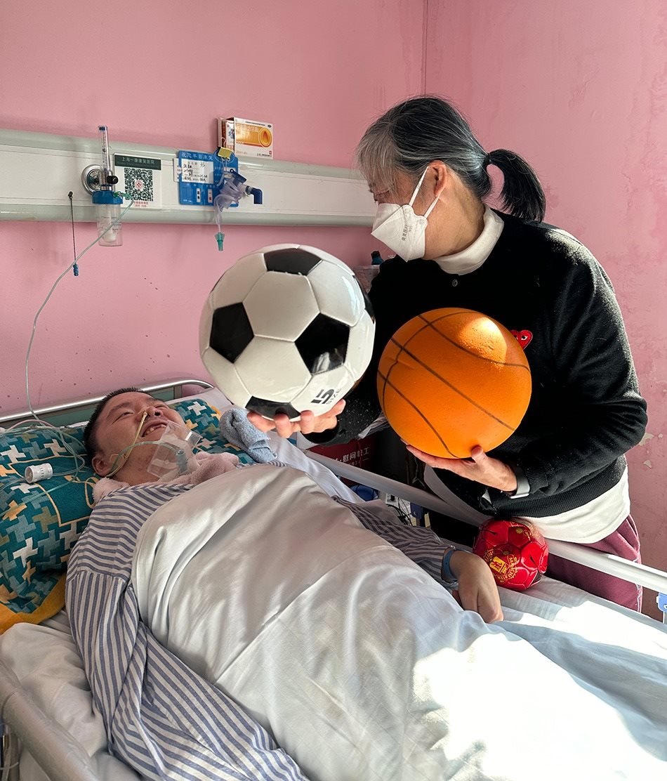 張昌碩恢復(fù)微小意識后,鄭建英從家里帶了兩顆昌碩最喜歡的足球到病床前,一大一小。每次,她舉起一顆足球放到他眼前,問他:“哪只是曼聯(lián)的?”昌碩的視線會左右移動,選擇正確的那一顆。