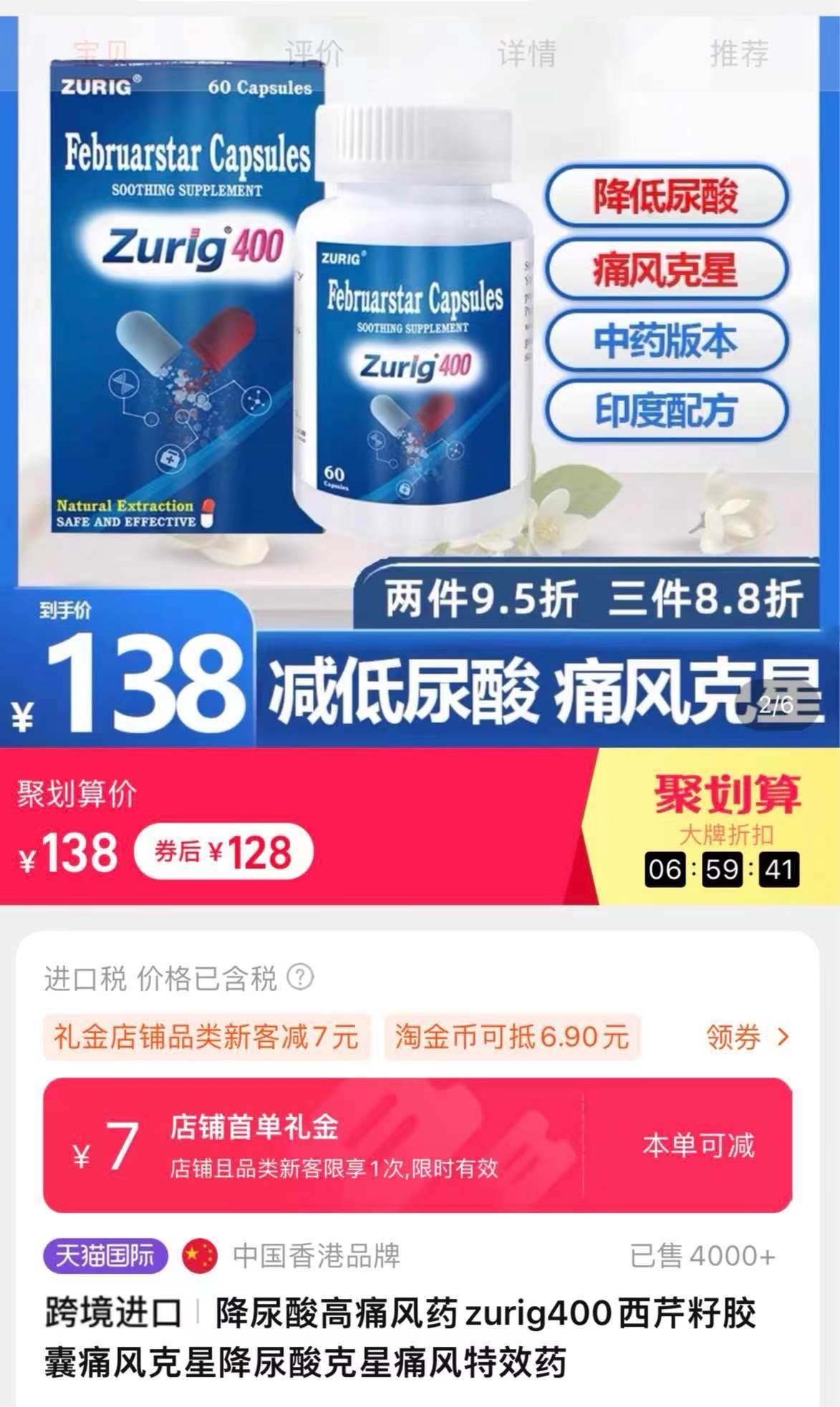 此外,zurig400在銷售頁面還模仿印度zurig80,宣稱降尿酸、痛風(fēng)藥。澎湃新聞記者調(diào)查發(fā)現(xiàn),zurig400目前在多個網(wǎng)購平臺有售,有商家顯示已出售4000+。 經(jīng)了解后得知,印度zurig80實(shí)際上是一款仿制藥,目前國內(nèi)并未獲批上市;而zurig400卻是一款香港產(chǎn)的保健品類目產(chǎn)品,并非藥品。但產(chǎn)品宣傳時卻使用“痛風(fēng)特效藥”“印度配方”“中藥非布”等詞語,讓患者產(chǎn)生誤會。