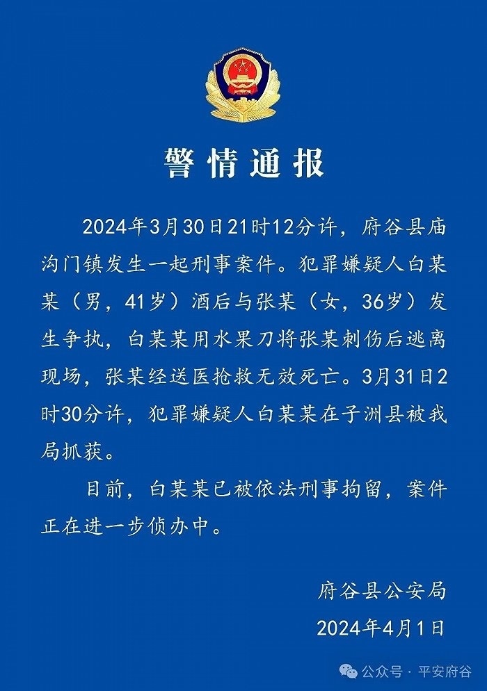 央視網消息:據陜西府谷縣公安局通報,3月30日21時12分許,府谷縣廟溝門鎮(zhèn)發(fā)生一起刑事案件。犯罪嫌疑人白某某(男,41歲)酒后與張某(女,36歲)發(fā)生爭執(zhí),白某某用水果刀將張某刺傷后逃離現(xiàn)場,張某經送醫(yī)搶救無效死亡。3月31日2時30分許,犯罪嫌疑人白某某在子洲縣被府谷縣公安局抓獲。