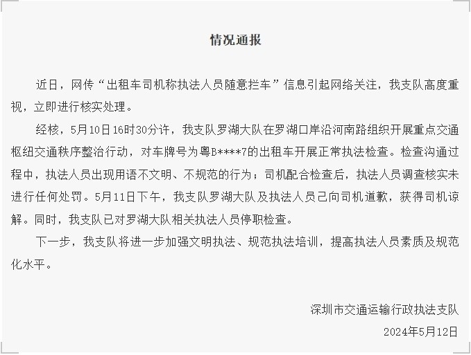 經(jīng)核,5月10日16時(shí)30分許,深圳市交通運(yùn)輸行政執(zhí)法支隊(duì)羅湖大隊(duì)在羅湖口岸沿河南路組織開展重點(diǎn)交通樞紐交通秩序整治行動,對車牌號為粵B****7的出租車開展正常執(zhí)法檢查。檢查溝通過程中,執(zhí)法人員出現(xiàn)用語不文明、不規(guī)范的行為;司機(jī)配合檢查后,執(zhí)法人員調(diào)查核實(shí)未進(jìn)行任何處罰。5月11日下午,深圳市交通運(yùn)輸行政執(zhí)法支隊(duì)羅湖大隊(duì)及執(zhí)法人員己向司機(jī)道歉,獲得司機(jī)諒解。同時(shí),深圳市交通運(yùn)輸行政執(zhí)法支隊(duì)已對羅湖大隊(duì)相關(guān)執(zhí)法人員停職檢查。