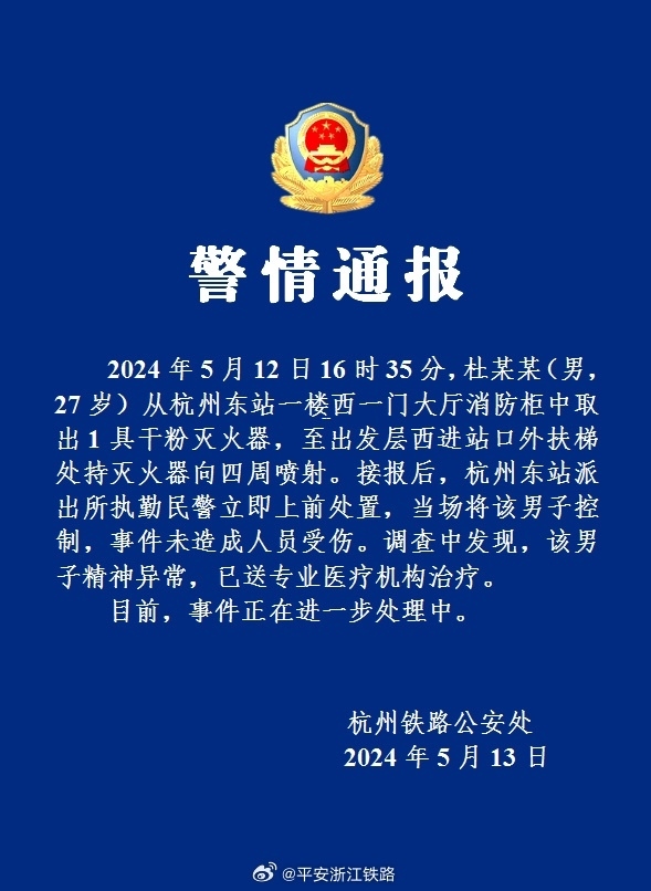 央視網(wǎng)消息:據(jù)“平安浙江鐵路”微博消息,杭州鐵路公安處5月13日通報(bào),2024年5月12日16時(shí)35分,杜某某(男,27歲)從杭州東站一樓西一門(mén)大廳消防柜中取出1具干粉滅火器,至出發(fā)層西進(jìn)站口外扶梯處持滅火器向四周?chē)娚?。接?bào)后,杭州東站派出所執(zhí)勤民警立即上前處置,當(dāng)場(chǎng)將該男子控制,事件未造成人員受傷。調(diào)查中發(fā)現(xiàn),該男子精神異常,已送專業(yè)醫(yī)療機(jī)構(gòu)治療。目前,事件正在進(jìn)一步處理中。