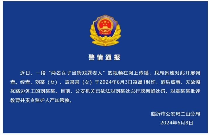 警方通報(bào)“兩女子當(dāng)街戲耍老人”:系酒后滋事,一人被行拘