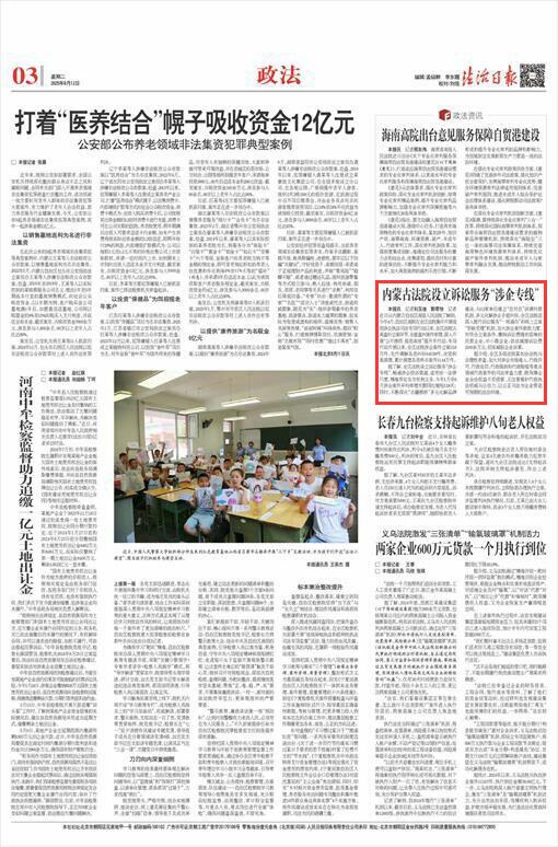2025年8月12日,《法治日報(bào)》第3版刊發(fā)題為《內(nèi)蒙古法院設(shè)立訴訟服務(wù)“涉企專線”》的文章,報(bào)道了自治區(qū)高院在全區(qū)法院集中開展規(guī)范涉企執(zhí)法司法專項(xiàng)行動以來,全區(qū)法院認(rèn)真查糾立案環(huán)節(jié),全面查糾案件審理,深入開展“公開透明 規(guī)范高效”提升年行動。