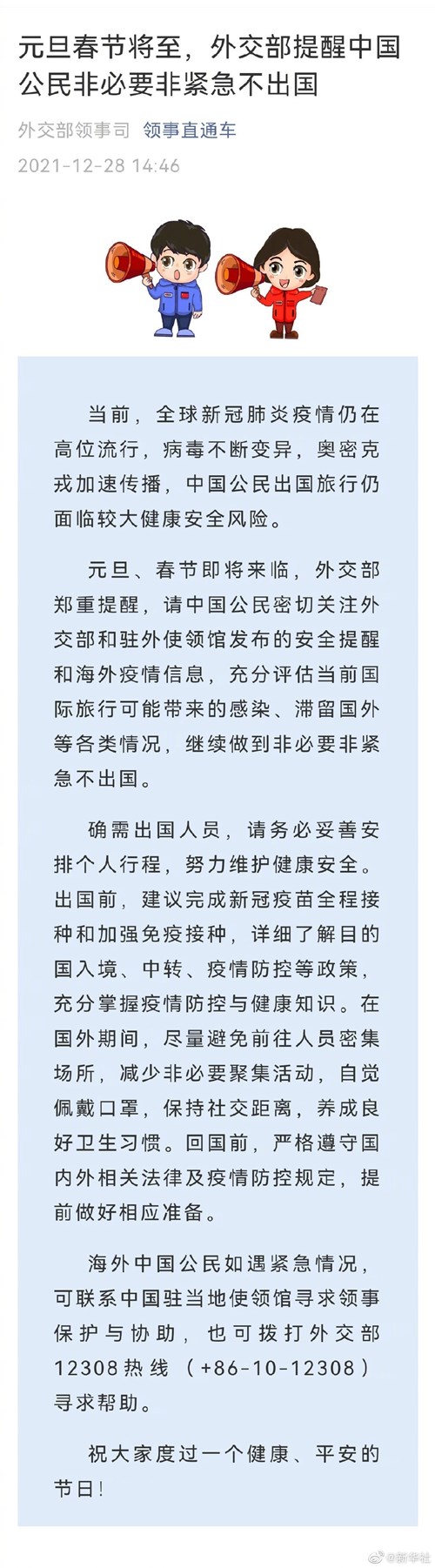 元旦、春節(jié)即將來臨,外交部鄭重提醒,請中國公民密切關(guān)注外交部和駐外使領(lǐng)館發(fā)布的安全提醒和海外疫情信息,充分評估當前國際旅行可能帶來的感染、滯留國外等各類情況,繼續(xù)做到非必要非緊急不出國。