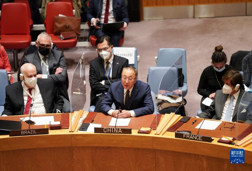 2月21日,在位于紐約的聯(lián)合國總部,中國常駐聯(lián)合國代表張軍(前中)在安理會舉行的審議烏克蘭問題緊急會議上發(fā)言。新華社記者 王迎 攝