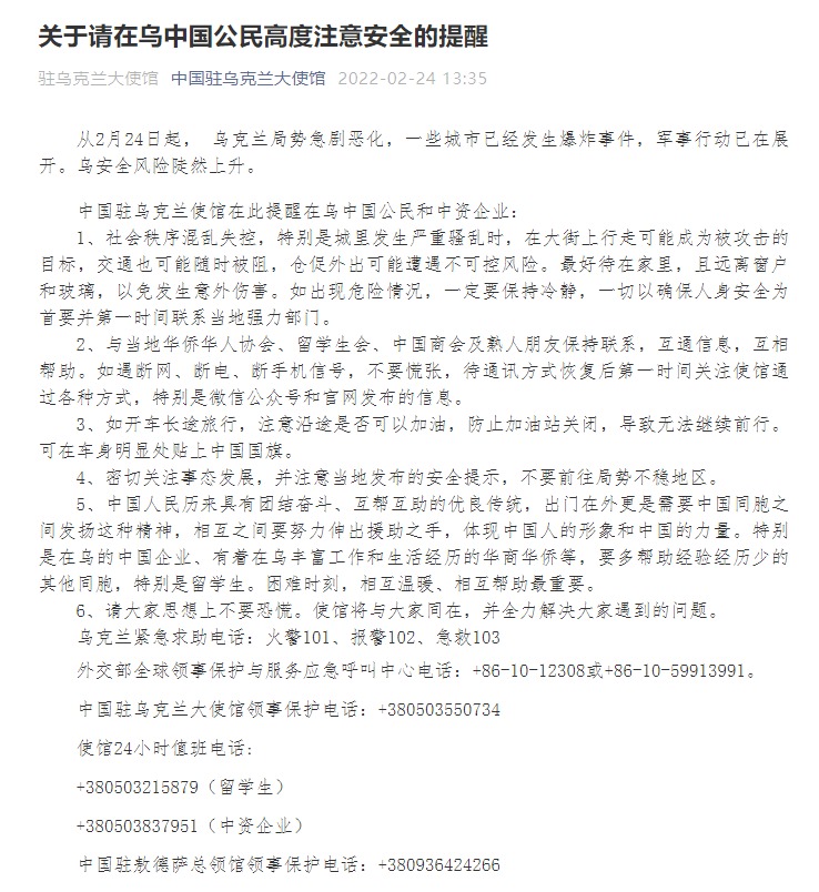 從2月24日起,烏克蘭局勢急劇惡化,一些城市已經(jīng)發(fā)生爆炸事件,軍事行動已在展開。烏安全風險陡然上升。