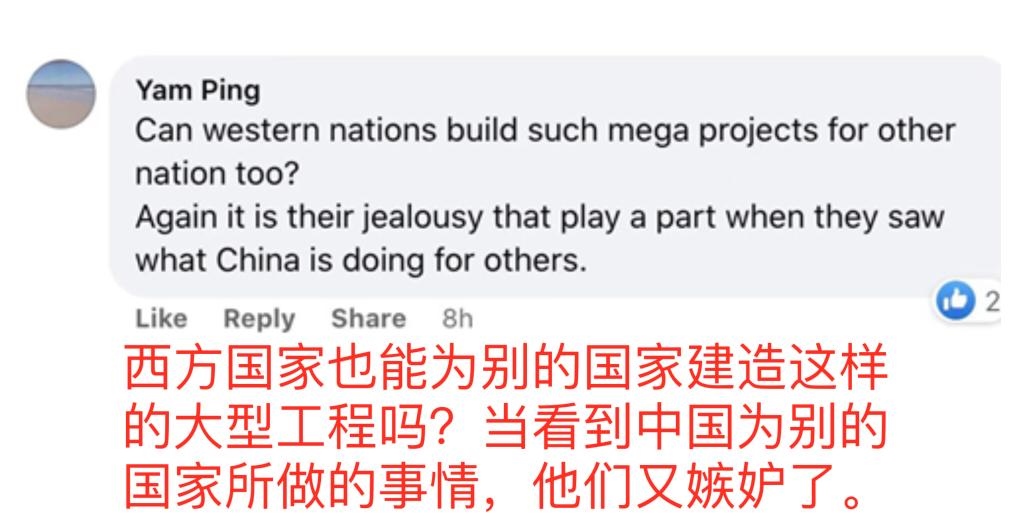 網(wǎng)友亞姆·平說:“西方國家也能為別的國家建造這樣的大型工程嗎?當(dāng)看到中國為別的國家所做的事情,他們又嫉妒了。”