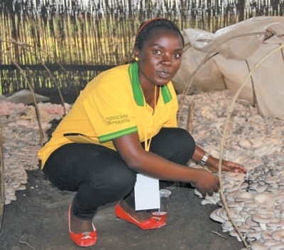 盧旺達(dá)國(guó)立大學(xué)的學(xué)生姍臺(tái)在菇棚中采收平菇。 中國(guó)國(guó)家菌草工程技術(shù)研究中心供圖