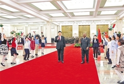 會(huì)談前,習(xí)近平在人民大會(huì)堂北大廳為邦戈舉行歡迎儀式。