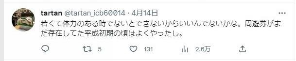 “只有年輕體力好的時候才能(這樣旅游),挺好的。在還有周游券的平成年代初期,我也這么干過。”