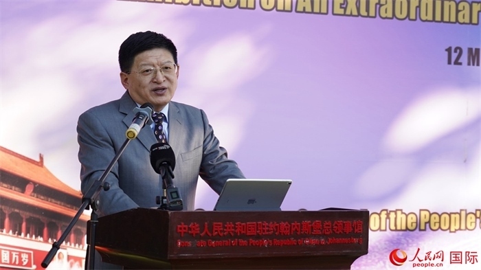 5月12日,中國(guó)駐約翰內(nèi)斯堡總領(lǐng)館在館內(nèi)舉辦新時(shí)代中國(guó)非凡十年成就圖片展,慶祝中南建交25周年。人民網(wǎng) 劉暢攝