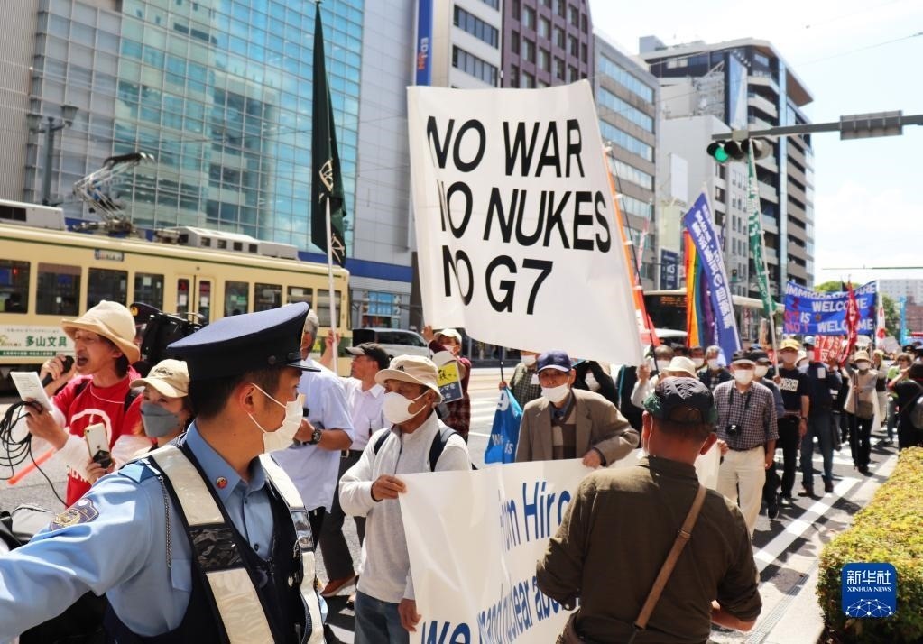 “不做戰(zhàn)爭幫兇”“不要G7”……14日,200多名日本民眾舉著各式標(biāo)語,在廣島和平紀(jì)念公園原子彈轟炸遺址舉行集會,強(qiáng)烈抗議七國集團(tuán)(G7)峰會將在廣島召開。