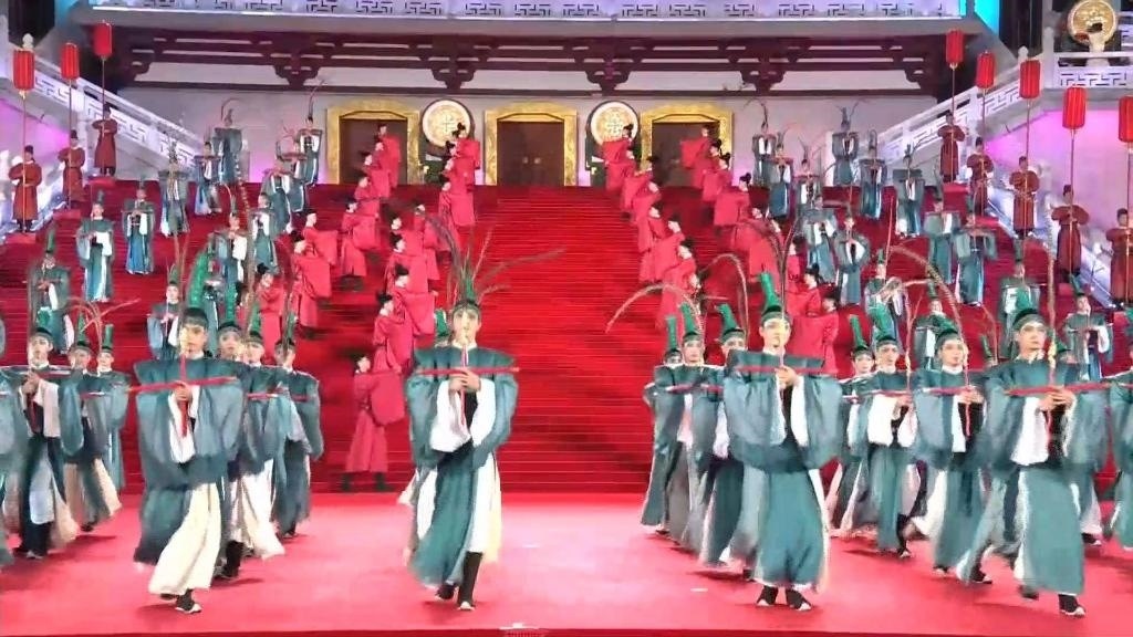 紫云樓前,禮樂(lè)和鳴,明快有力的古代佾舞、絢麗婀娜的芙蓉花舞,表達(dá)了古都西安人民的熱情好客,體現(xiàn)了中華文化兼容并蓄的精神風(fēng)貌。