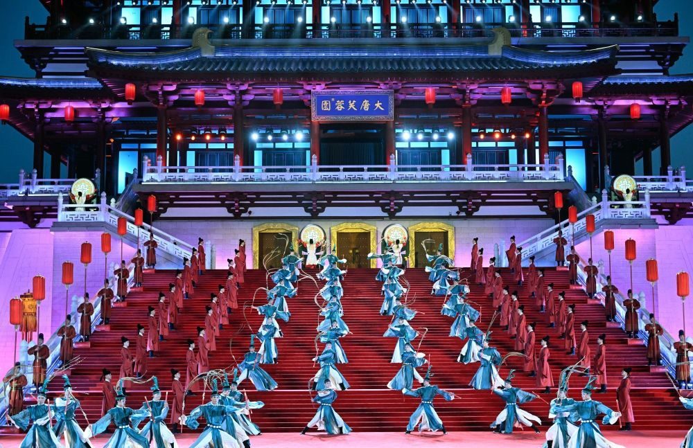 習近平夫婦為貴賓舉行唐朝傳統(tǒng)迎賓儀式。紫云樓前,禮樂和鳴,明快有力的古代佾舞、絢麗婀娜的芙蓉花舞,表達了古都西安人民的熱情好客,體現(xiàn)了中華文化兼容并蓄的精神風貌。