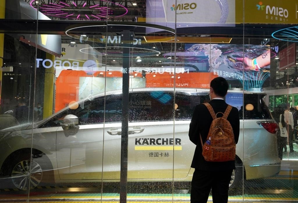 2021年11月6日,觀(guān)眾在第四屆進(jìn)博會(huì)德國(guó)卡赫展臺(tái)參觀(guān)全自動(dòng)洗車(chē)機(jī)器人的演示。(新華社記者劉穎攝)