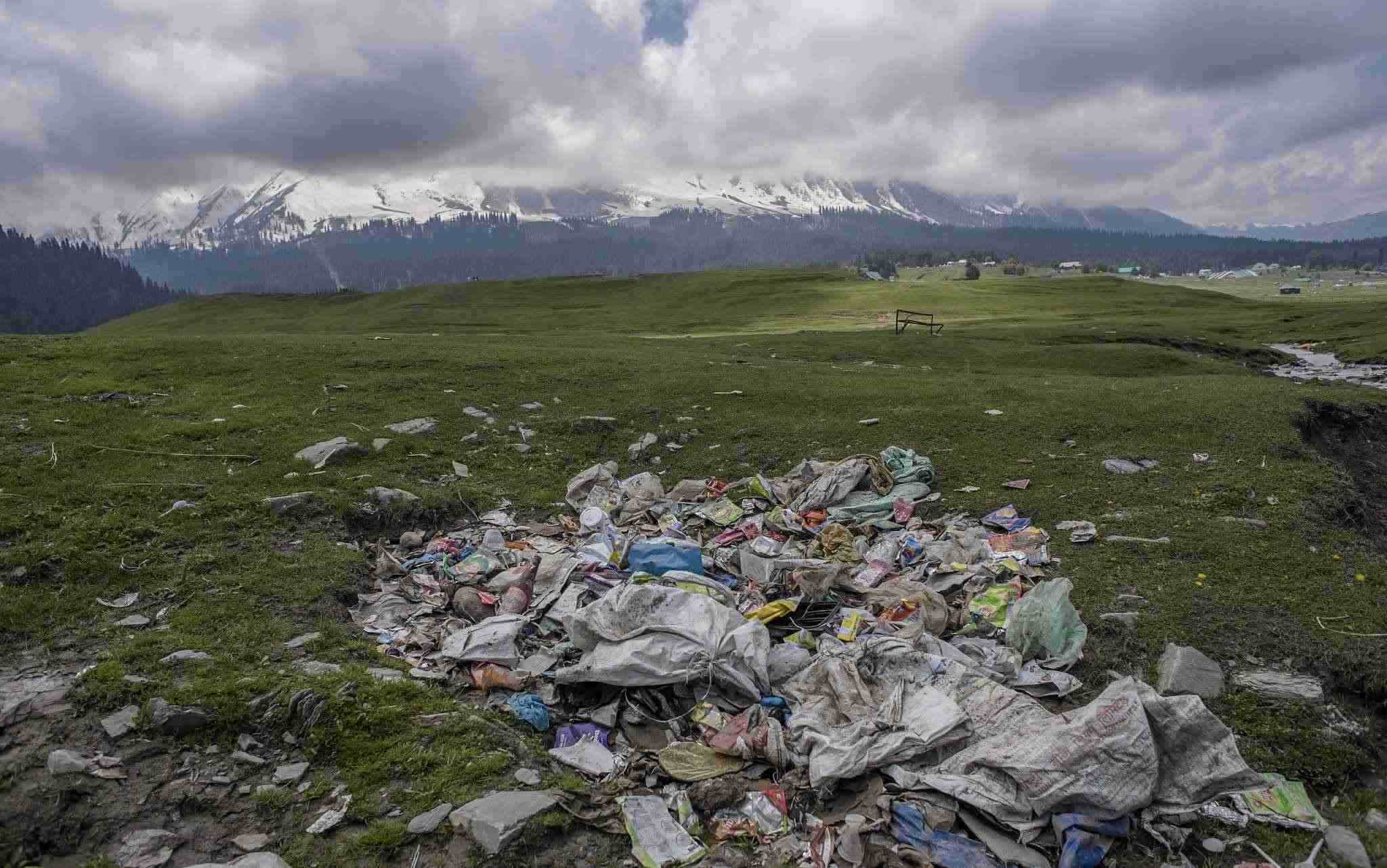 古爾瑪格,著名的滑雪勝地。在夏天,這個(gè)勝地?cái)D滿了避暑的游客并留下了大量的垃圾。垃圾的堆積對(duì)高山生態(tài)造成了嚴(yán)重威脅,也對(duì)冰川溪水造成了嚴(yán)重威脅。盡管指示牌提醒人們禁止攜帶塑料,但對(duì)攜帶食物和水沒有限制。環(huán)保人士警告說,古爾瑪格及其周邊地區(qū)的到處都是被丟棄的塑料垃圾。