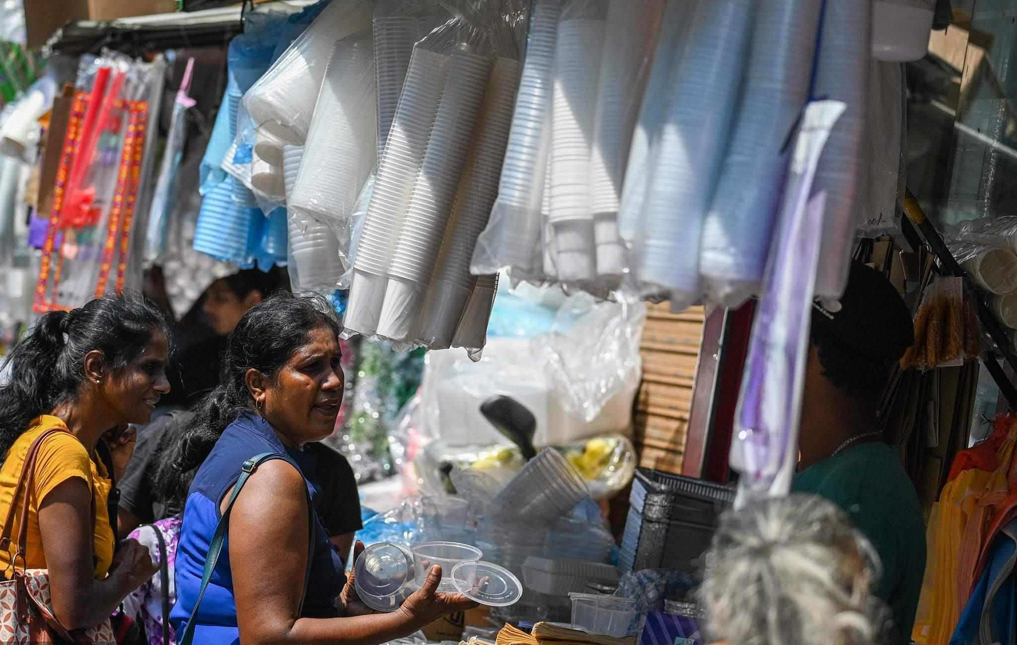 當(dāng)?shù)貢r(shí)間2023年2月14日,斯里蘭卡科倫坡市場(chǎng)的一家商店里,顧客在購買塑料餐具。