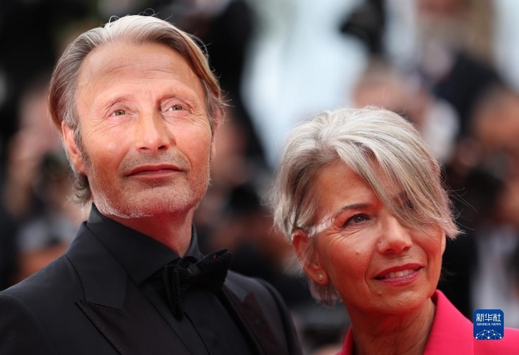 5月16日,在法國戛納舉行的第76屆戛納國際電影節(jié)上,演員麥德斯·米科爾森攜妻子亮相開幕式紅毯。   新華社記者 高靜 攝