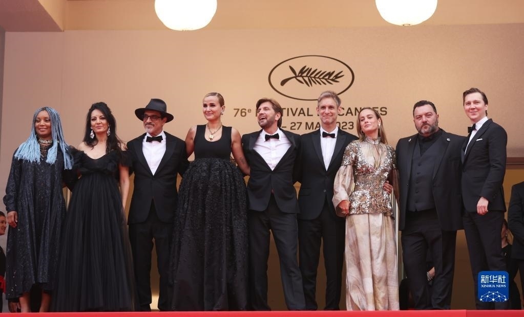 5月16日,在法國戛納舉行的第76屆戛納國際電影節(jié)上,主競賽單元評審團(tuán)主席、瑞典導(dǎo)演魯本·奧斯特倫德(中)攜眾評委亮相開幕式紅毯。   新華社記者 高靜 攝