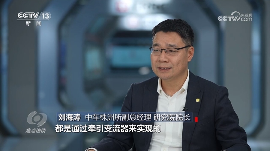 中車株洲所副總經理、研究院院長劉海濤:“在高鐵車窗上擺一枚硬幣,這枚硬幣在高鐵300公里時速運行工況下依然非常平穩(wěn)。過程中的加減速以及恒速控制,都是通過牽引變流器實現(xiàn)的?!?/p>