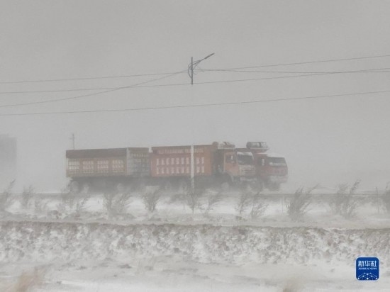 5月20日,在蒙古國蘇赫巴托爾省,貨車在暴風(fēng)雪中行駛。新華社發(fā)(蒙古國蘇赫巴托爾省BBS電視臺(tái)供圖)