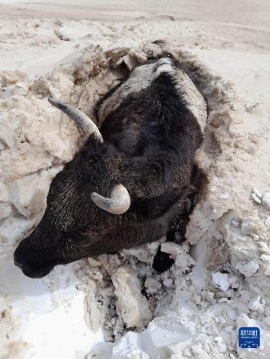 5月20日,在蒙古國蘇赫巴托爾省,一頭牛被埋在雪堆中。新華社發(fā)(蒙古國蘇赫巴托爾省BBS電視臺(tái)供圖)