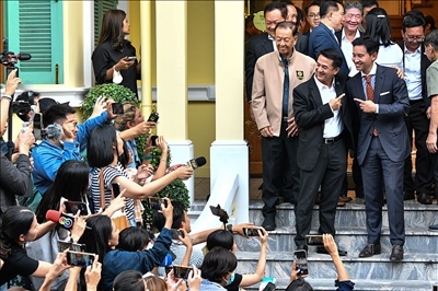 當地時間2023年5月17日,泰國曼谷,泰國遠進黨黨魁皮塔與泰國為泰黨黨魁春拉南在與聯(lián)盟伙伴舉行會議后合影。