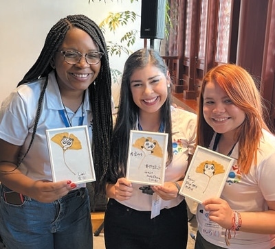 拉美青年代表展示自己學(xué)習(xí)創(chuàng)作的葉畫作品。本報記者 姜 波攝